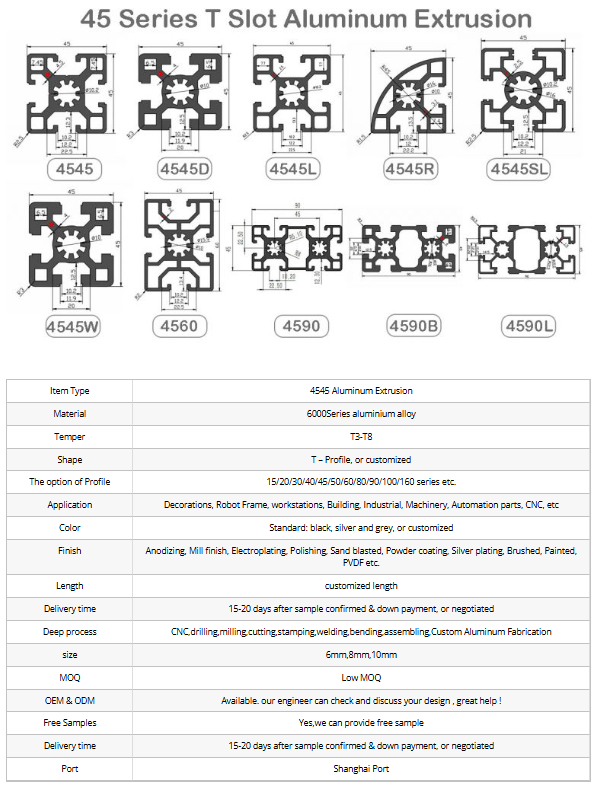 Notably, it’s known for its size range of 45mm x 45mm to 90mm. What’s more, the 4545 aluminum extrusion is crafted from 6000 series aluminum alloy, with available tempers ranging from T3 to T8.