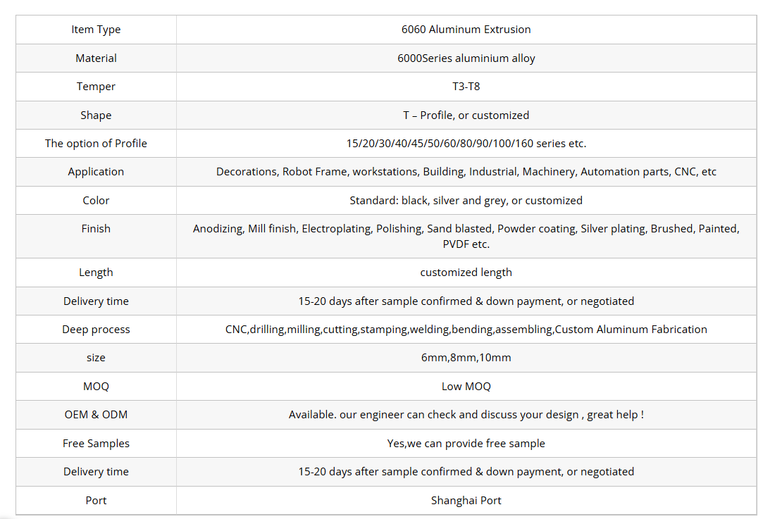 Our 6060 aluminum extrusion effectively addresses your structural needs. It is primarily used in machine frames, safety guards, and workstations. Additionally, it finds applications in conveyors, enclosures, and more.